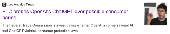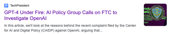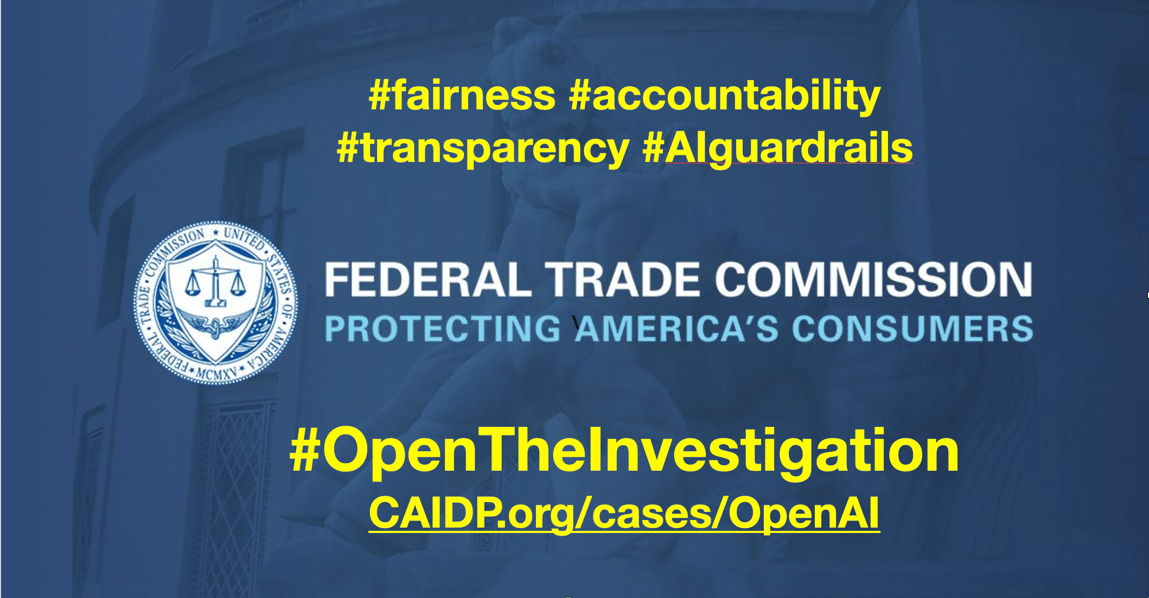 Today (Nov 15, 2023), the Center for AI and Digital Policy urged the Federal Trade Commission to move forward the investigation of OpenAI and issue an order to establish safeguards and guardrails for ChatGPT.