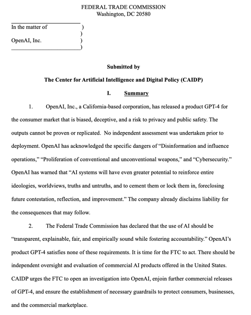 "OpenAI, Inc., a California-based corporation, has released a product GPT-4 for the consumer market that is biased, deceptive, and a risk to privacy and public safety. The outputs cannot be proven or replicated. No independent assessment was undertaken prior to deployment. . . . There should be independent oversight and evaluation of commercial AI products offered in the United States. CAIDP urges the FTC to open an investigation into OpenAI, enjoin further commercial releases of GPT-4, and ensure the establishment of necessary guardrails to protect consumers, businesses, and the commercial marketplace."