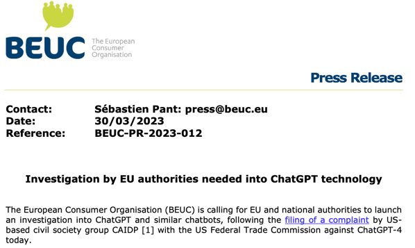 Consumer advocacy group BEUC also called on EU and national authorities - including data-protection watchdogs - to investigate ChatGPT and similar chatbots, following the filing of a complaint in the US.