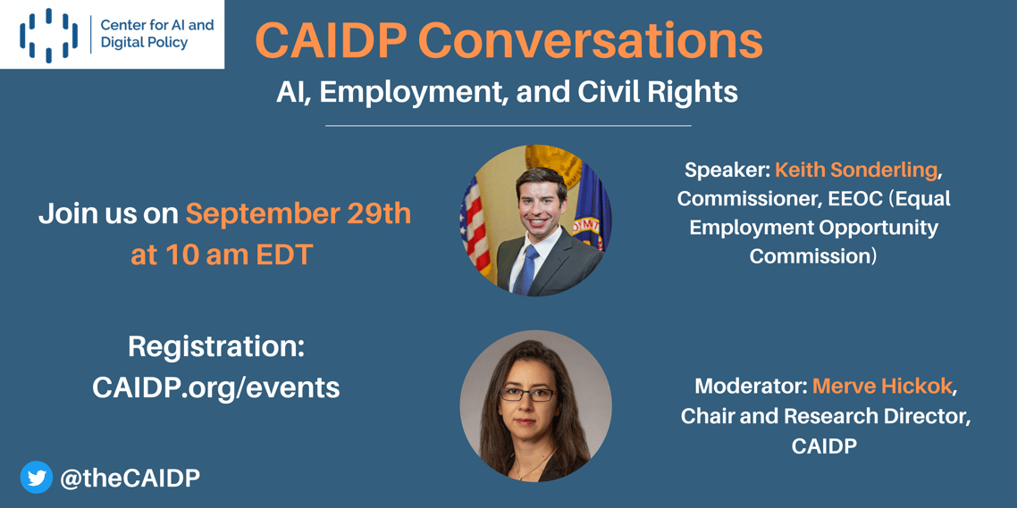 Join EEOC Commissioner Keith Sonderling and CAIDP Research Director Merve Hickok for this informative CAIDP Conversation, discussing AI policy, governance, principles in employment decisions.