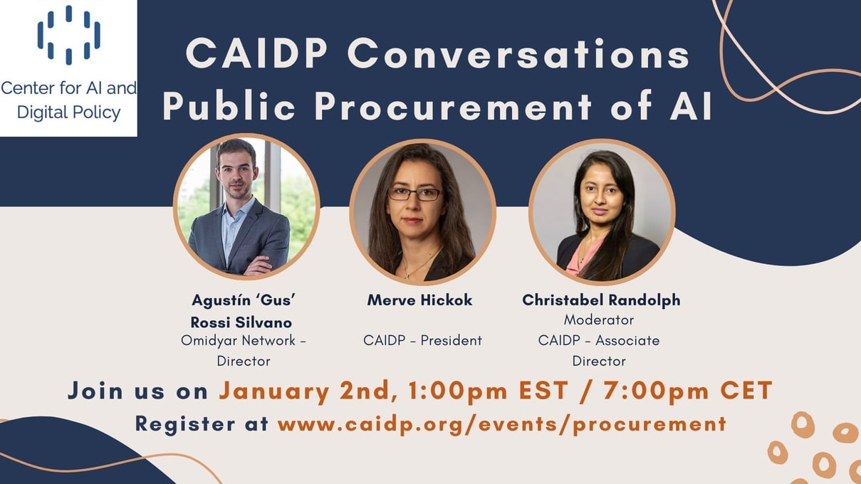 2025's first CAIDP Conversations focuses on the critical importance of public procurement of AI. Christabel Randolph moderates a discussion between Gus Rossi (Omidyar Network) and Merve Hickok (CAIDP). Gus Rossi recently authored an article "Public Procurement as AI Industrial Policy" arguing for a model of leveraging public procurement to drive sustainable practices in AI. Merve Hickok published a book "From Trustworthy AI Principles to Public Procurement Practices" in which she provides actionable recommendations for practitioners and policymakers on how to implement trustworthy AI principles in the procurement of AI systems and why such implementation is a necessity.