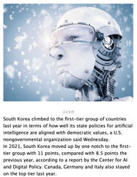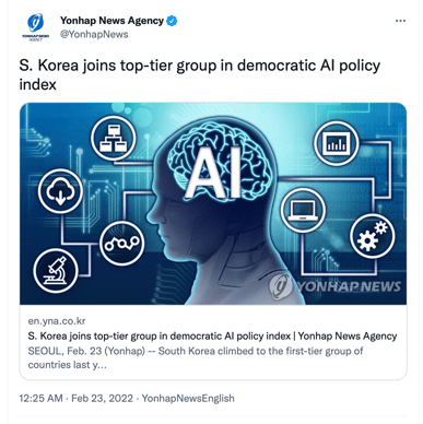 The Korea Herald, S. Korea joins top-tier group in democratic AI policy index (Feb. 23, 2022)