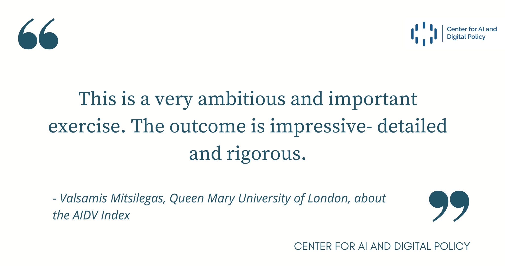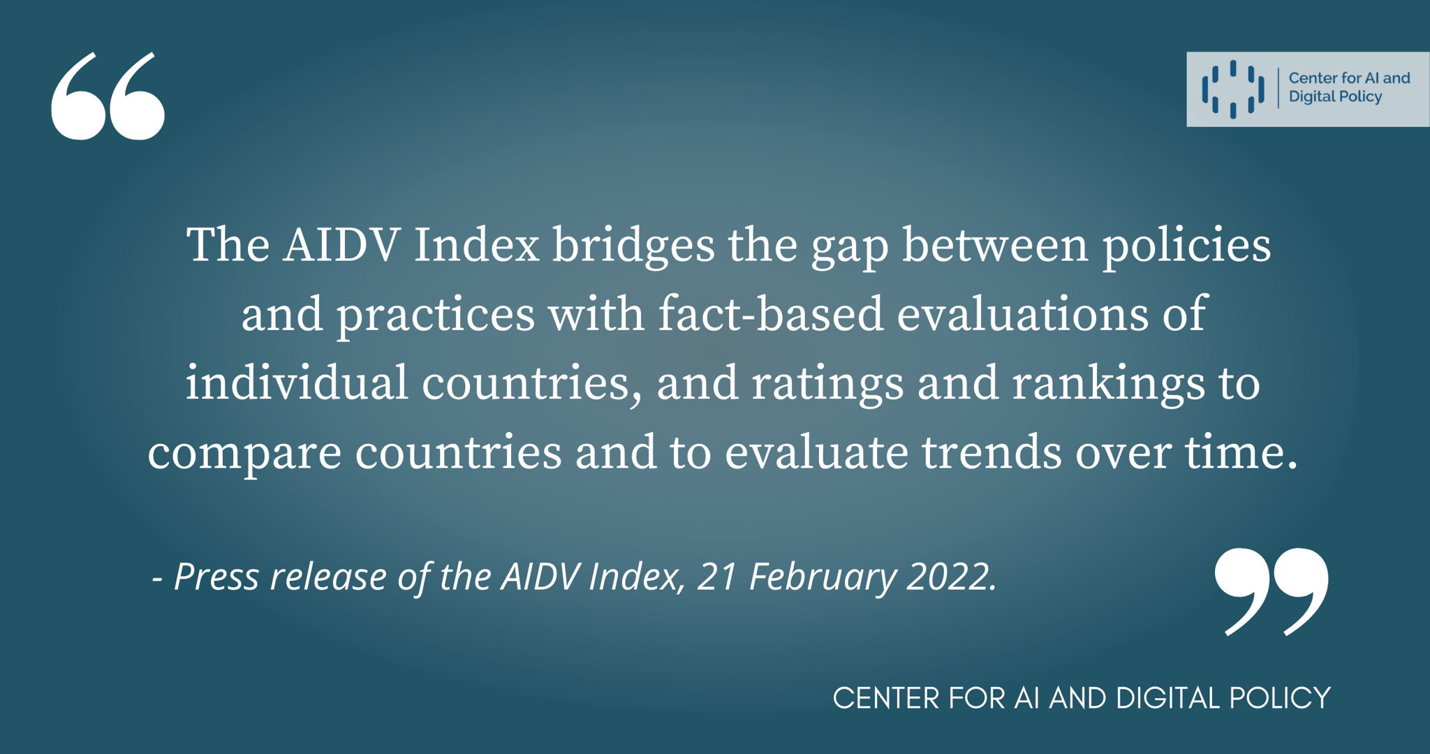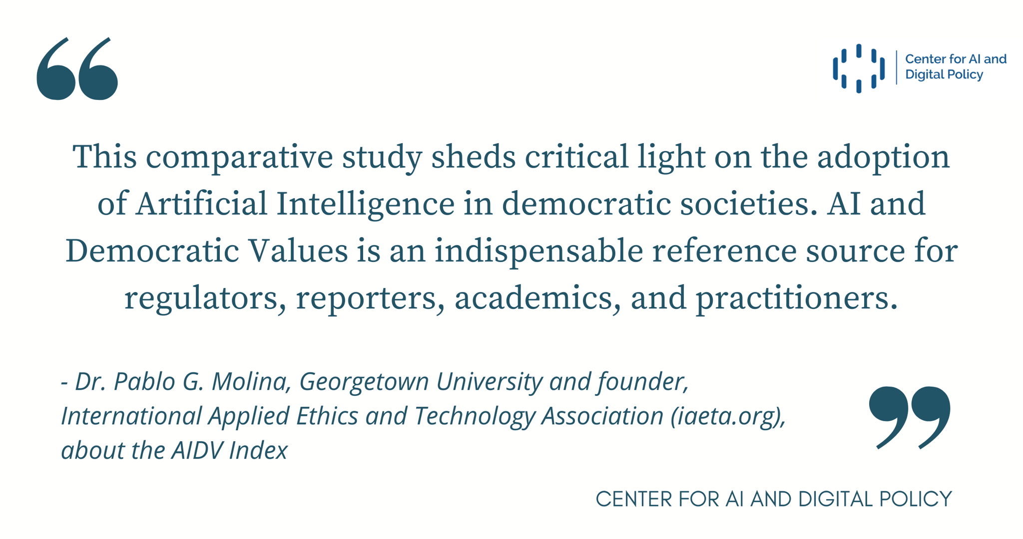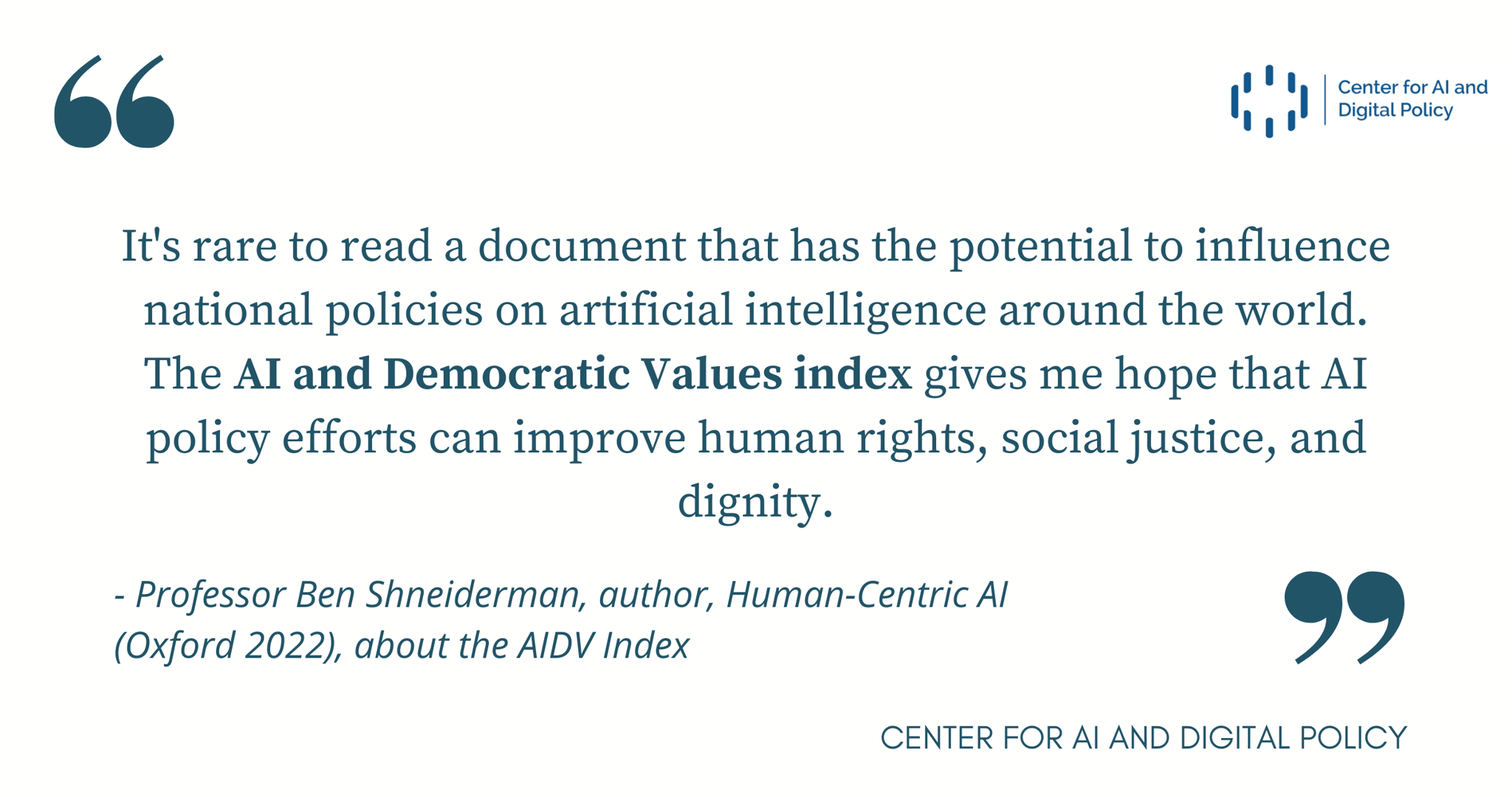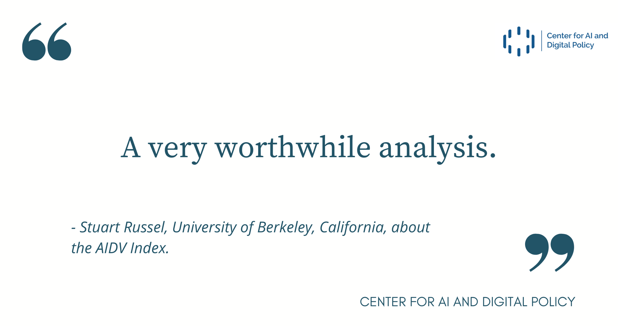 In 2020, the Center for AI and Digital Policy published the first worldwide assessment of AI policies and practices. Artificial Intelligence and Democratic Values rated and ranked 30 countries, based on a rigorous methodology and 12 metrics established to assess alignment with democratic values.