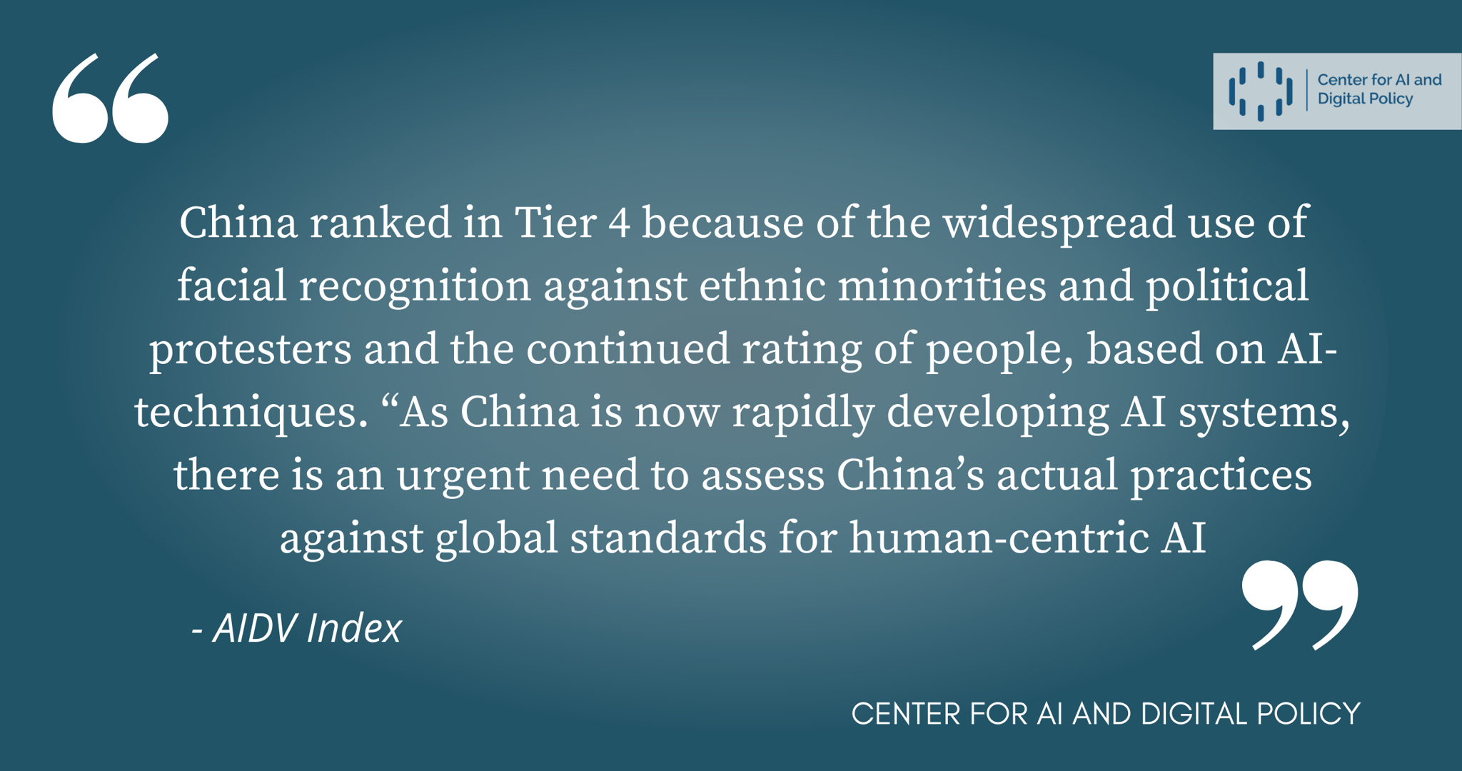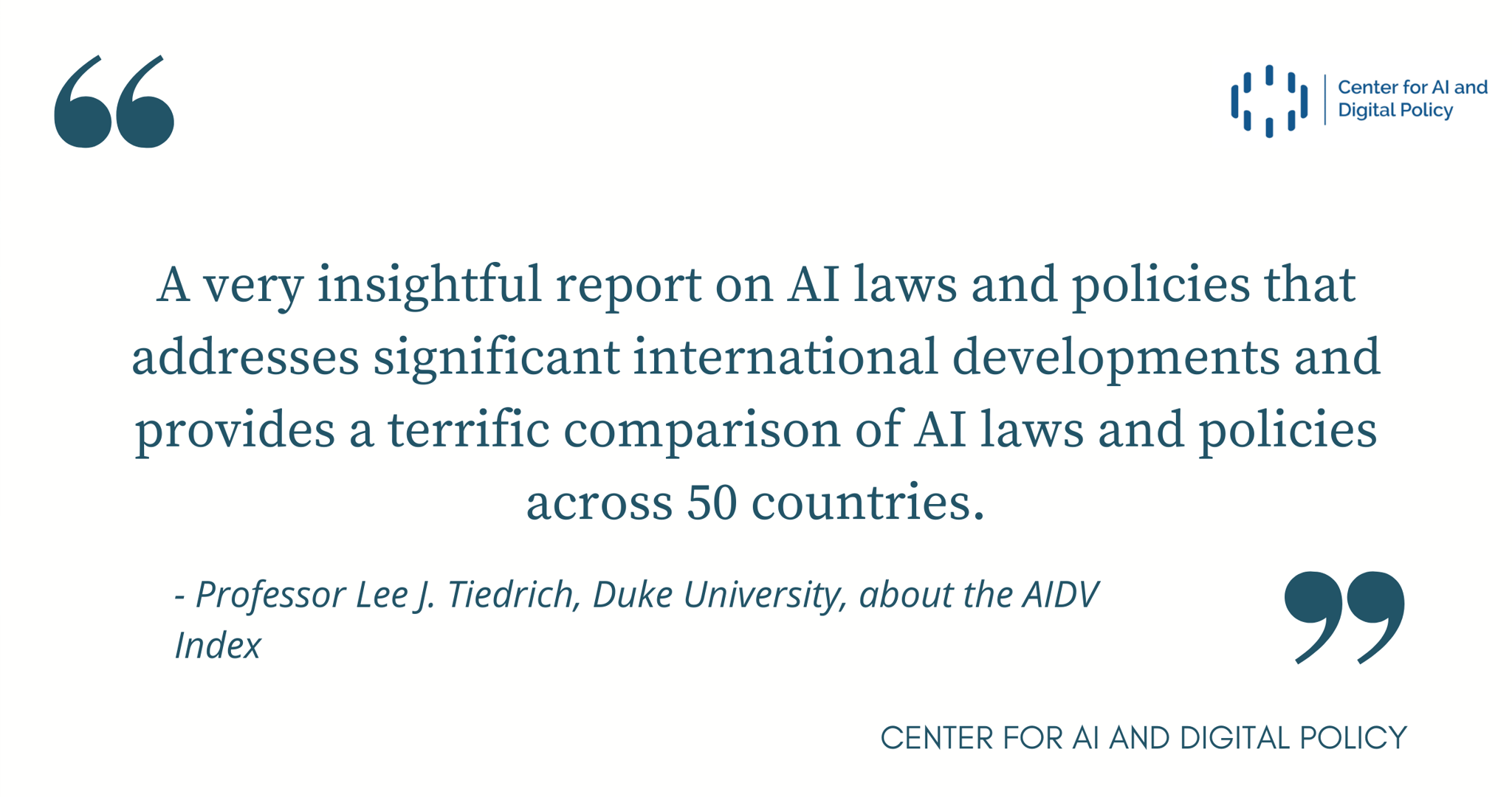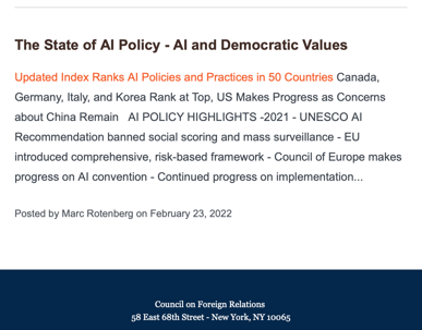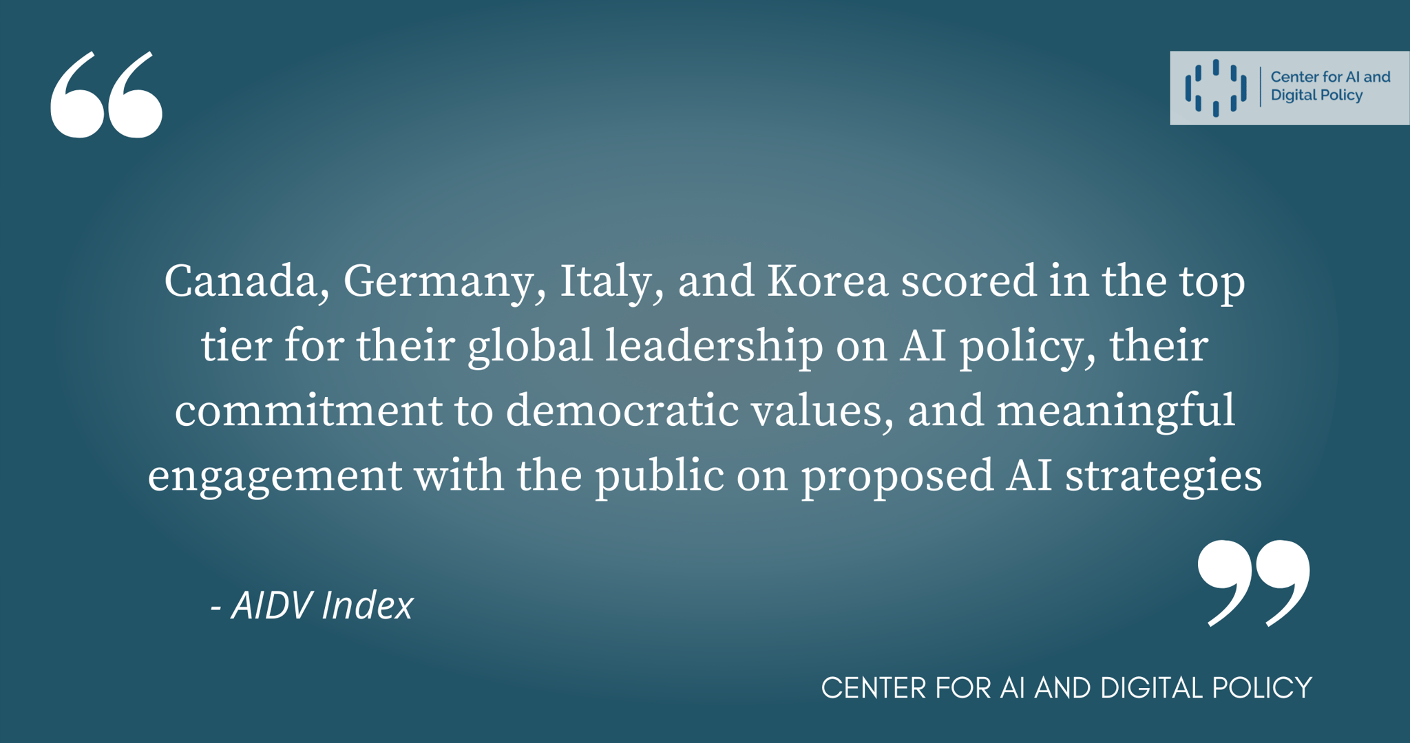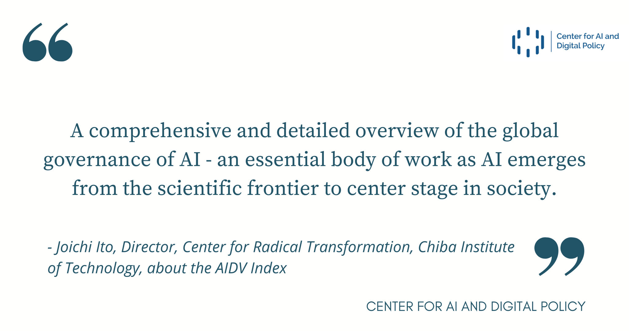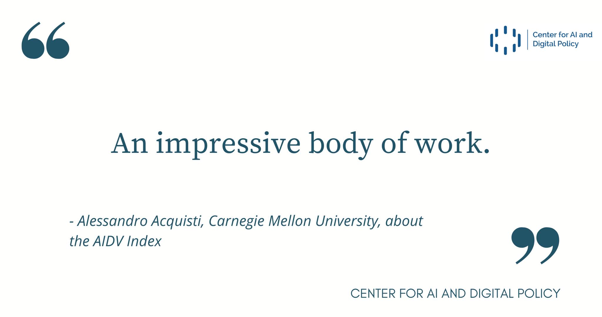 In 2020, the Center for AI and Digital Policy published the first worldwide assessment of AI policies and practices. Artificial Intelligence and Democratic Values rated and ranked 30 countries, based on a rigorous methodology and 12 metrics established to assess alignment with democratic values.